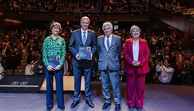 The candidates for the 2025 Chilean presidential elections, together with the President of SalmonChile, Arturo Clément, at the 'Salmon Summit 2025'. From left to right, candidates Evelyn Matthei and José Antonio Kast (now president-elect), Clément, and candidate Jeannette Jara.