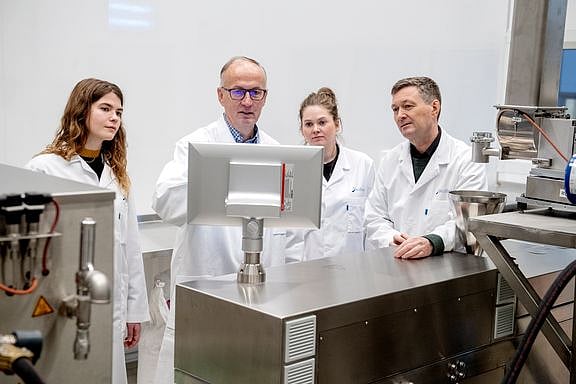 Tor Andreas Samuelsen (right) and colleagues at one of the extruders used in feed research.