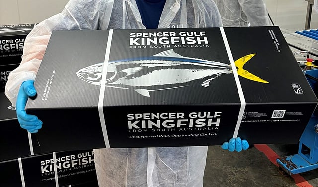 An operator displays a sustainable box of Spencer Gulf Kingfish - one of Clean Seas Sustainable Seafood's brands - at the Sydney Fish Market.