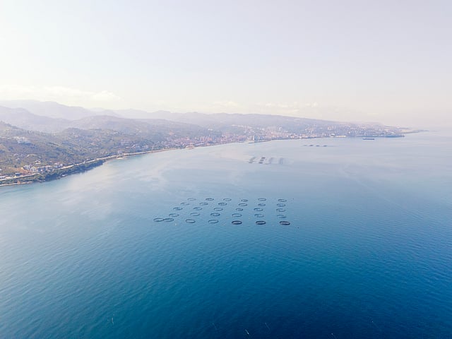 Aquaculture facilities off the coast of Arsin, Trabzon, Turkey.