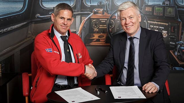 Steinþór Pálsson (right), when he was CEO of Landsbankinn, after signing an agreement with the Landsbjörg Accident Prevention Association.