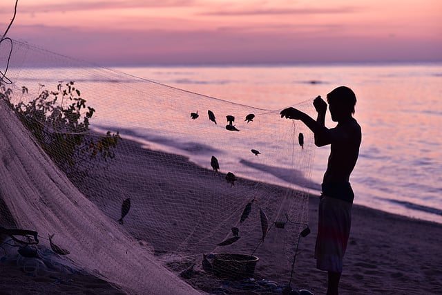Silhouette of the indonesian fisherman removing fishes from the fishin net, Gİli Meno Island, Indonesia.
