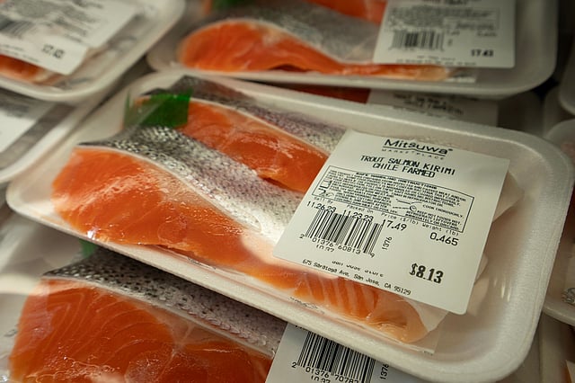 Farmed trout salmon from Chile in the cooler at a Mitsuwa store in San Jose, California, United States.