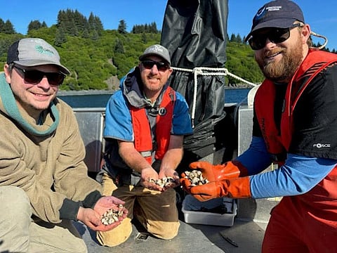 Pictured: NOAA Fisheries Alaska Aquaculture Team with juvenile oysters near Kodiak, Alaska.