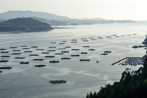 Mussel farms in the Vigo estuary. Rias Baixas, Galicia, Spain.