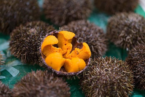 Image of sea urchin after farming. Empty sea urchins - that are preventing kelp forests from growing - are harvested from the sea bed and put into Urchinomics' land-based recirculating systems to turn them into premium sea urchin roe in 6 to 12 weeks.