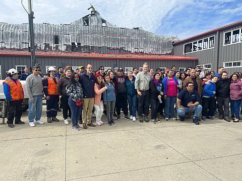 Part of the workers of Entrevientos - the salmon processing plant razed by fire in Magallanes, Chile - pose in front of the remains of the burned building. Although the layoffs, the company will compensate them beyond what is established by law.