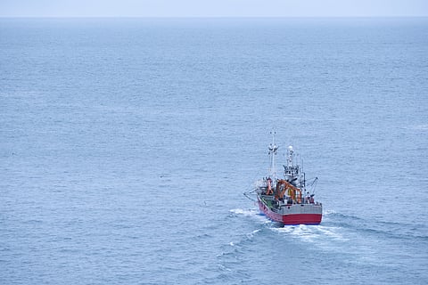 A fishing boat heads out to sea in the Bay of Biscay.